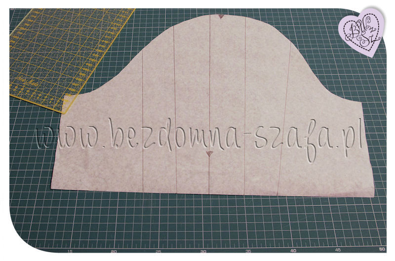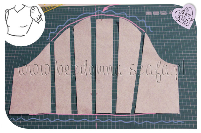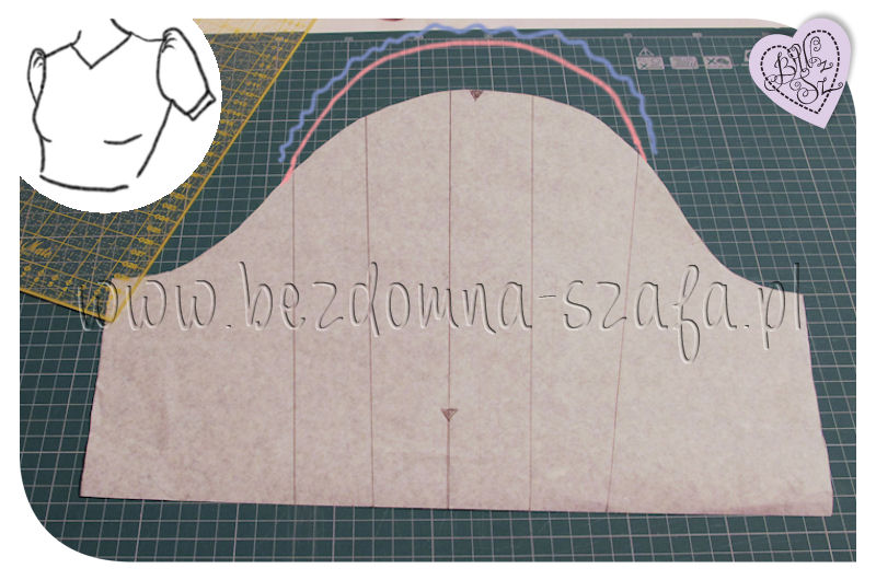 Najlepiej taki szablon ułożyć na kartce papieru i bezpośrednio na nią nakleić, a następnie wyciąć przemodelowany rękawek tak, jak wskazuje na to różowa linia.