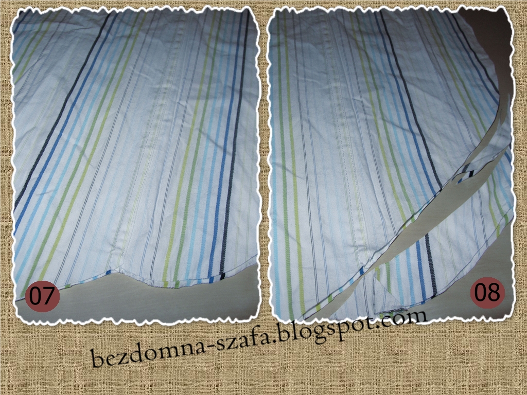 - Z pleców wykroiłam dół fartuszka, a że był za wąski (bo to mała koszula była), poszerzyłam go materiałem z rękawów. Połączyłam ściegiem… i tutaj nadal mam problem, czy jest to ścieg bieliźniany, czy francuski (zdj.06) – bardzo proszę w komentarzach o opinie 🙂