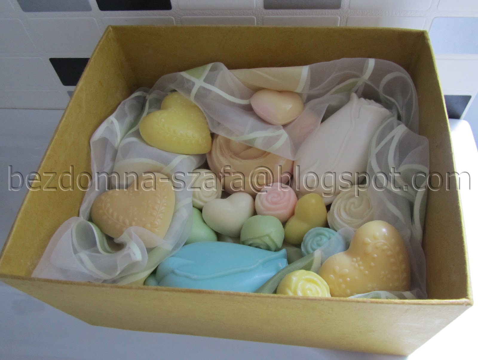 W pięknym pudełku znalazłam ogromną ilość kolorowych i pachnących mydełek o różnych kształtach. Oczywiście furorę w domu zrobiła żółciutka kaczuszka na sznureczku 🙂
