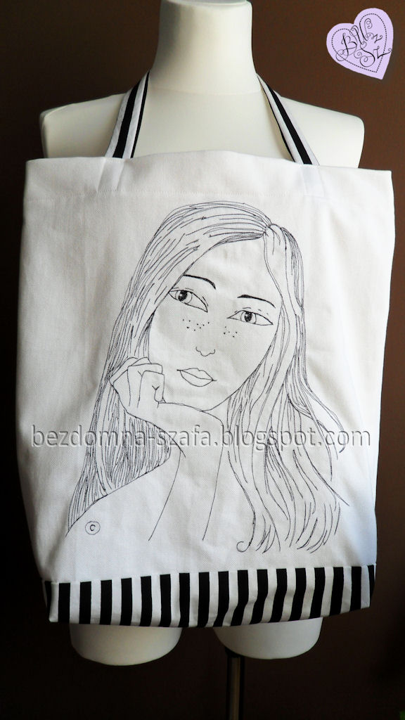 Kolorystykę ograniczyłam do dwóch podstawowych kolorów – czerni i bieli. Dno torby zrobiłam ciemniejsze, żeby użytkowanie było bardziej komfortowe. Kieszonkę w środku zaakcentowałam sercowo ♥