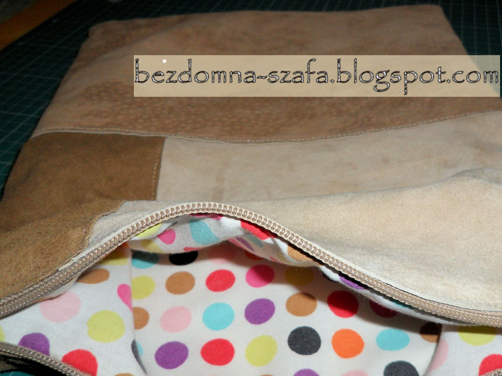- Szyjemy od suwaka jadąc wokół i kończymy przy drugim końcu suwaka. Ta część torby jest zamknięta, czyli szew biegnie dokoła bez żadnego otworu.