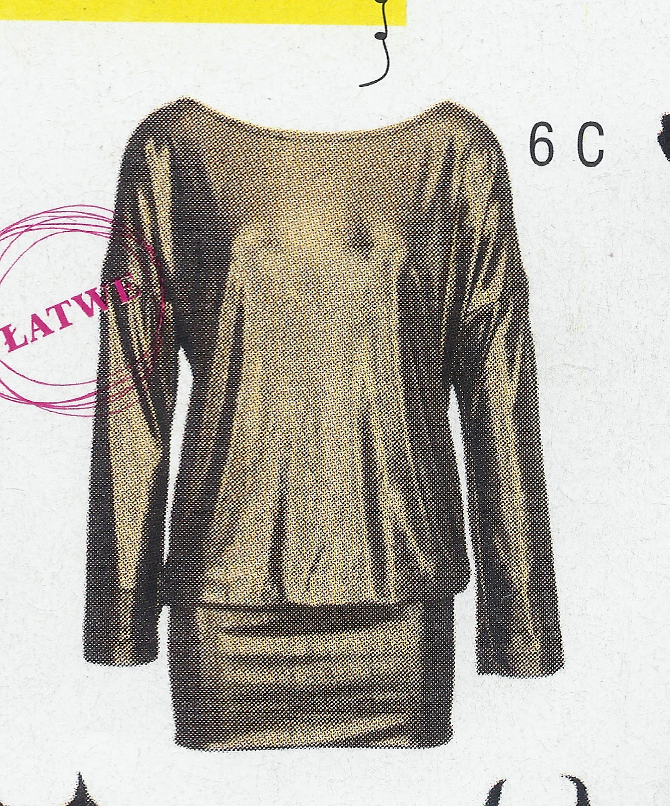 Wybrałam model „łatwy”, uszyłam testowo z o wiele grubszej dzianiny (brzydkiej jak noc zieleni butelkowej) i nic nie zmieniałam w wykroju.